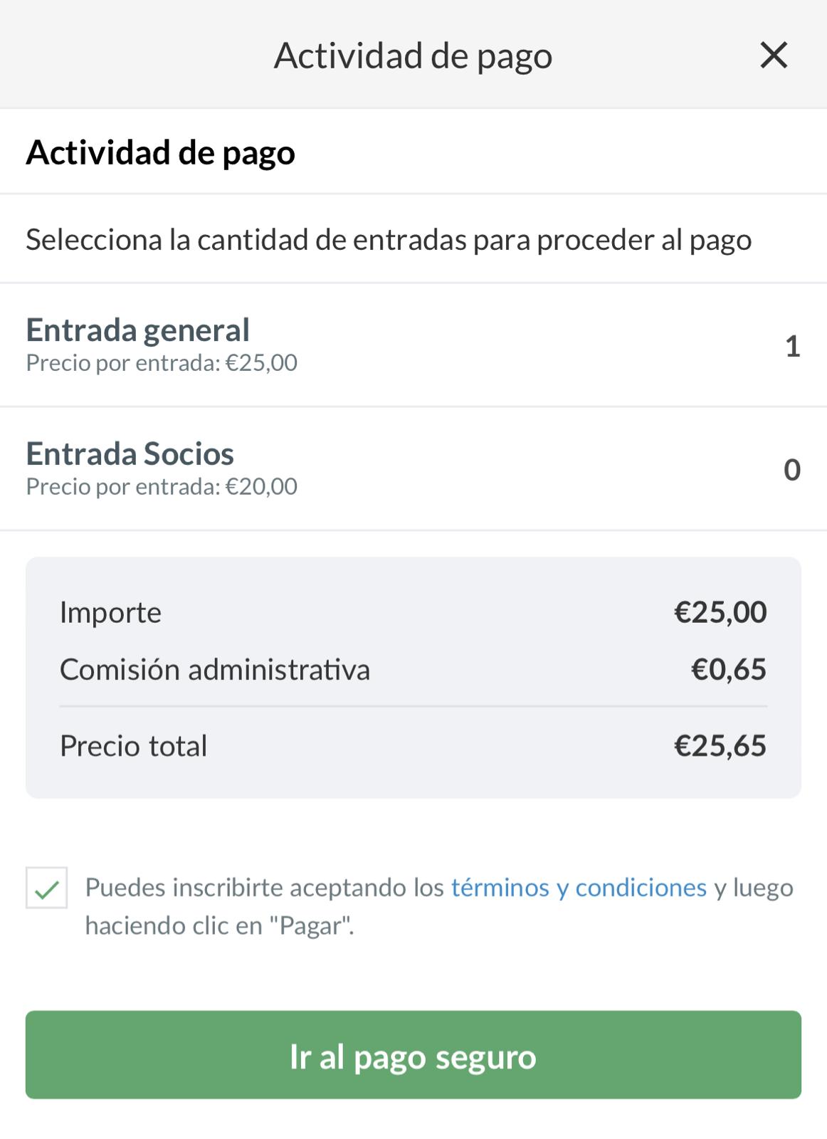 Ejemplo: aquí el deportista tiene 2 tipos de entradas a elegir. El pago se realiza a través del botón verde Ir al pago seguro.