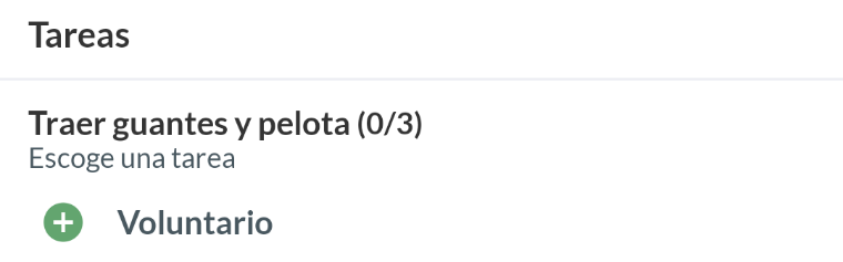 Ejemplo: la tarea voluntaria "Traer guantes y pelota" necesita 3 deportistas/entrenadores que pueden tomar la tarea haciendo clic en Voluntario.