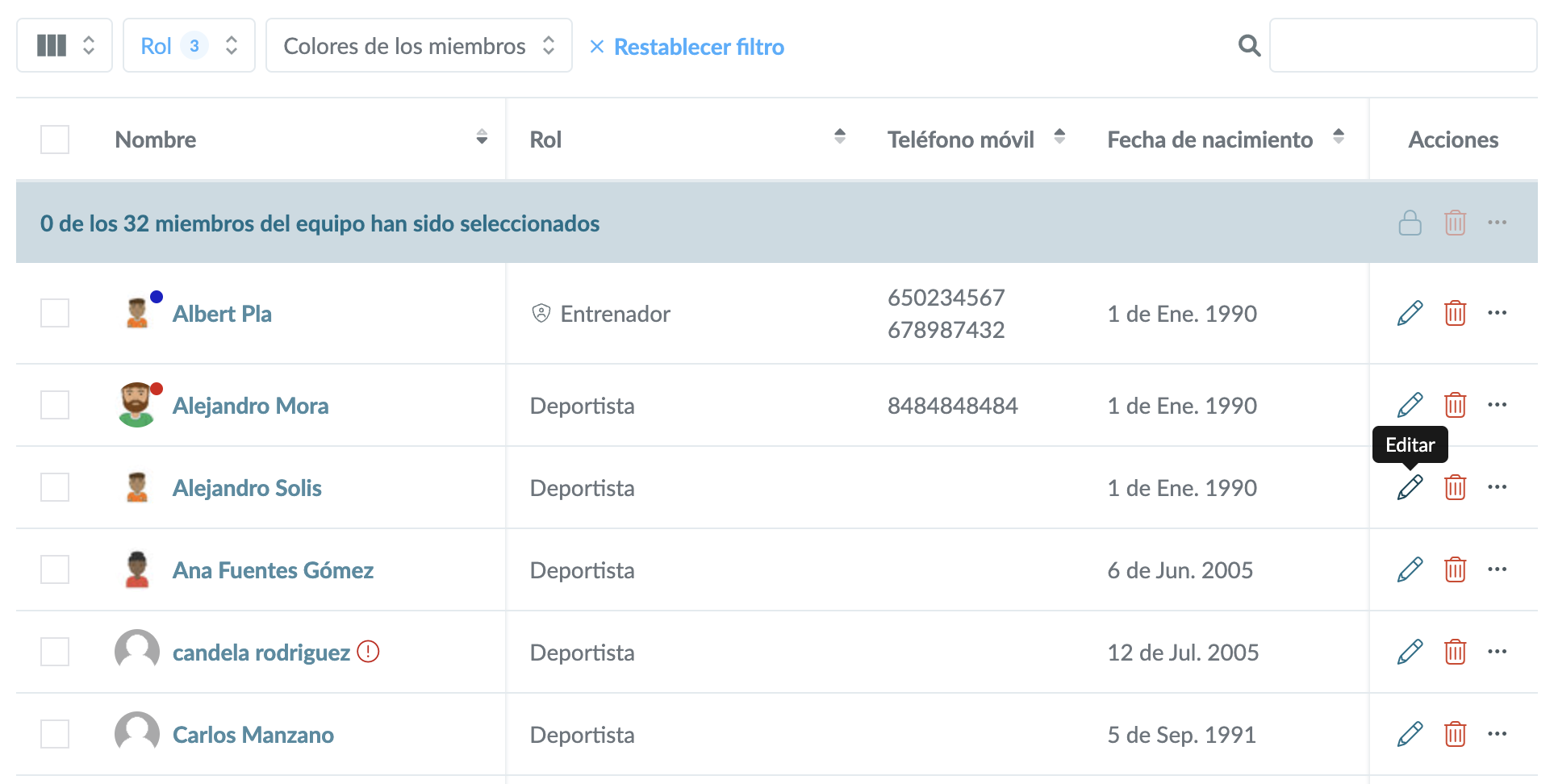 NOTA: Si cambias el rol de un deportista a entrenador, asistente o líder de equipo, le das a la persona el derecho de crear actividades/ editar los datos de los deportistas del equipo.