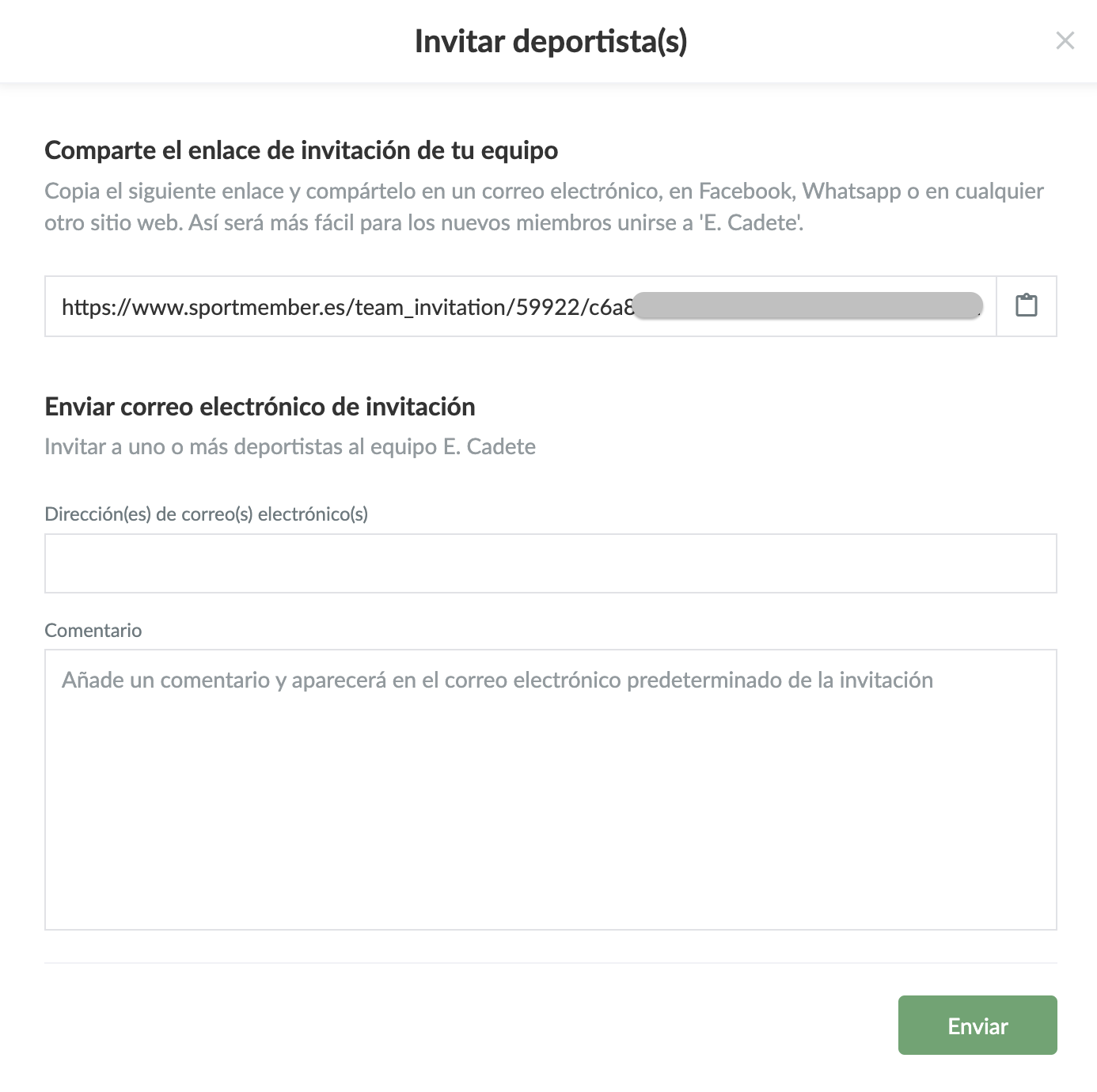 Copia el enlace de la invitación o escriba la(s) dirección(es) de correo electrónico en la casilla para enviar el enlace directamente desde aquí. Al hacer esto, termina con el botón verde Enviar