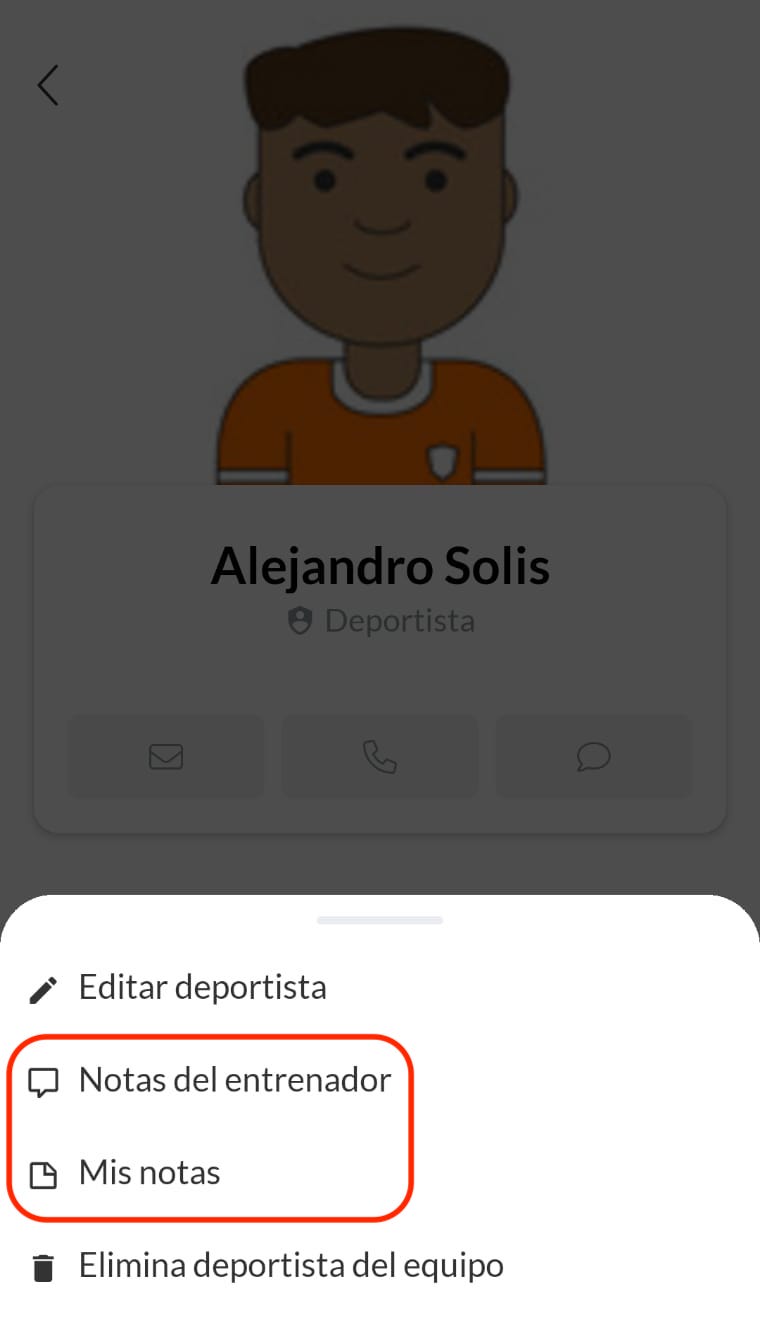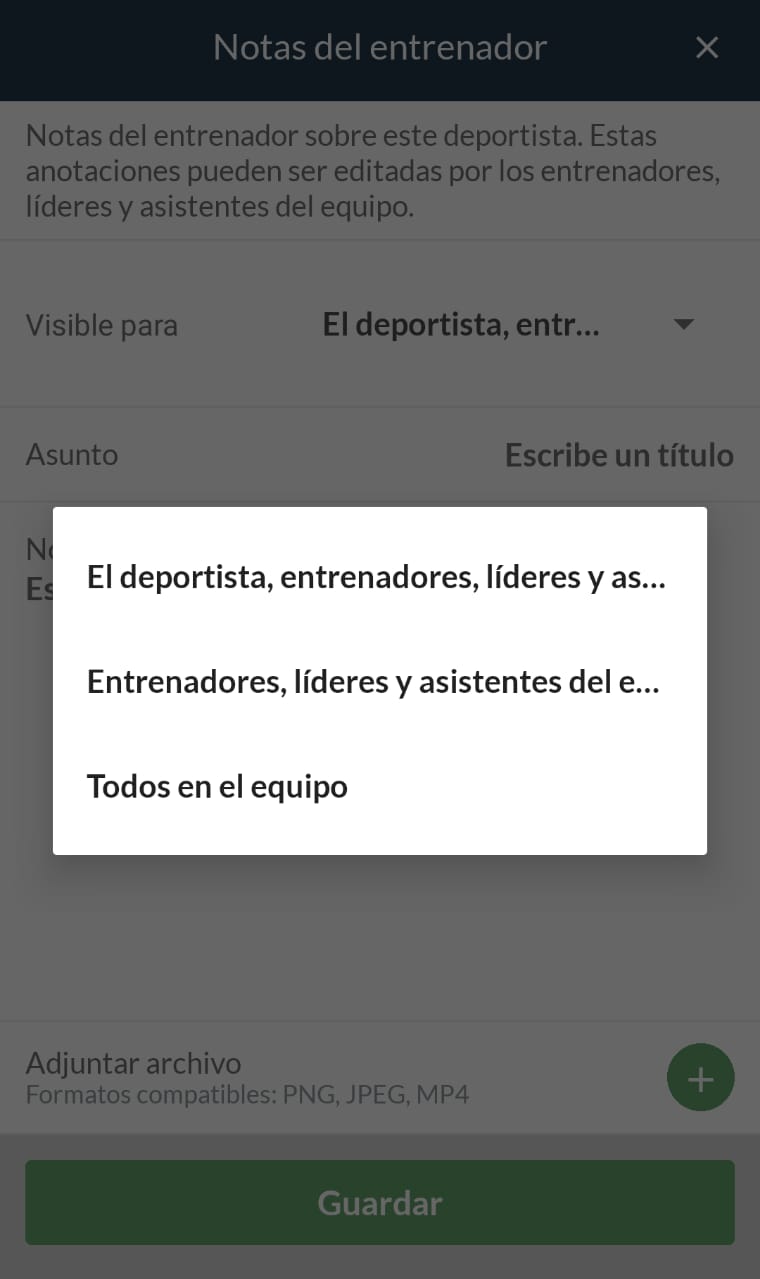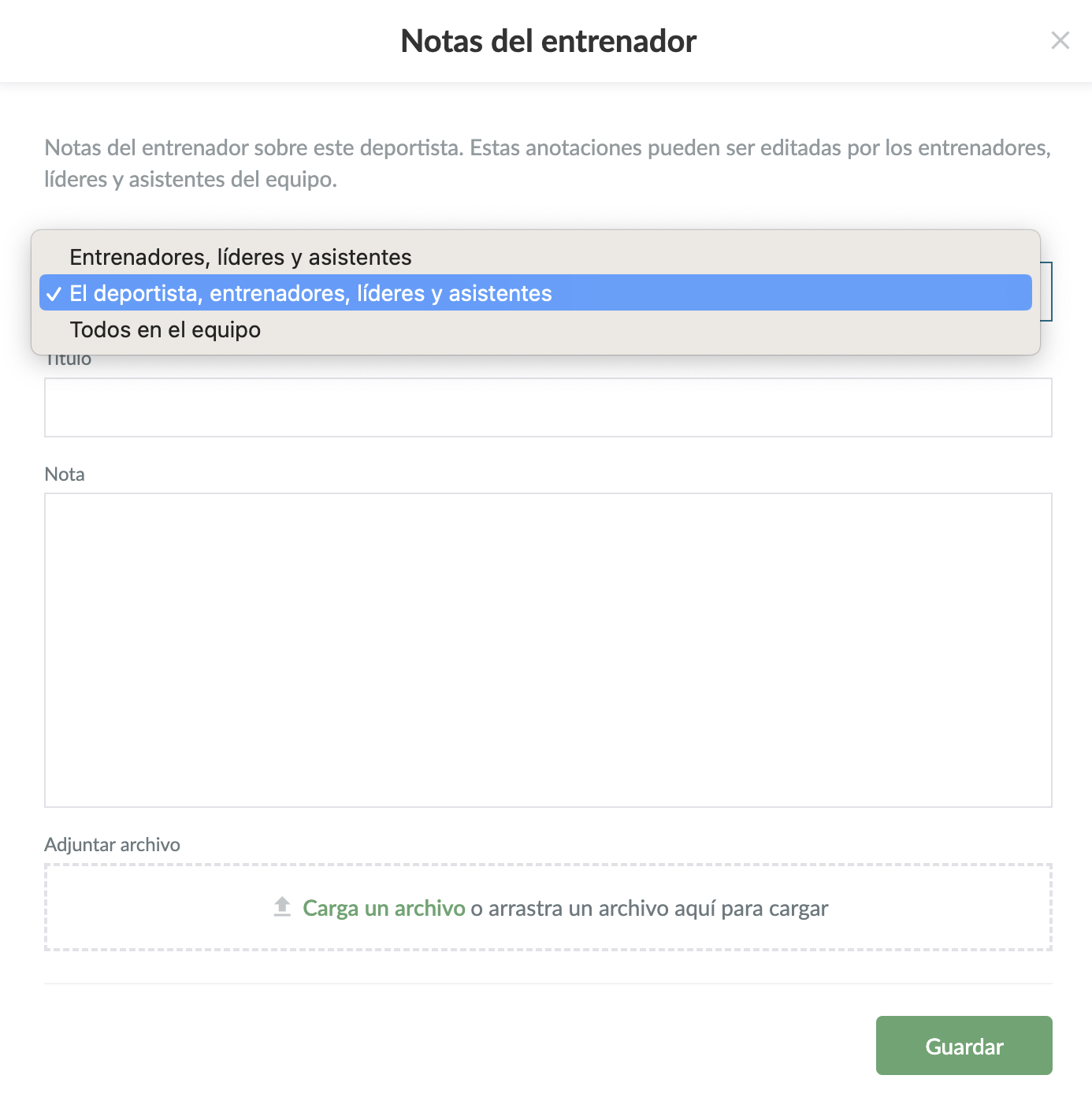 Al crearlo podrás definir quien puede ver las notas del entrenador (solo entrenadores y asistentes, o también el deportista, o si es visible para todo el equipo)