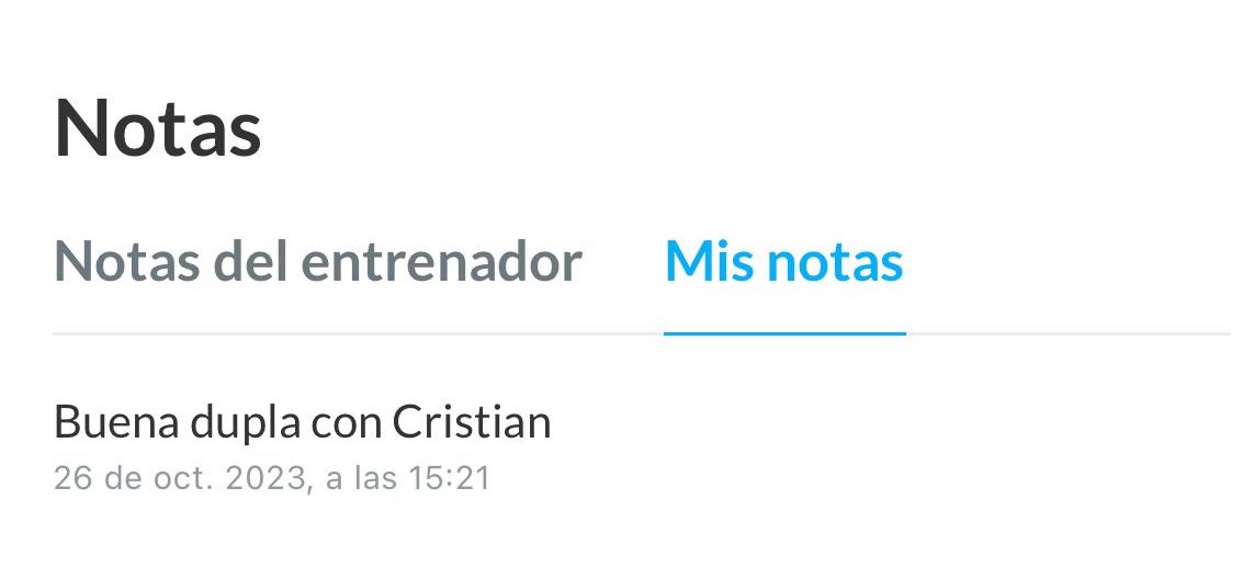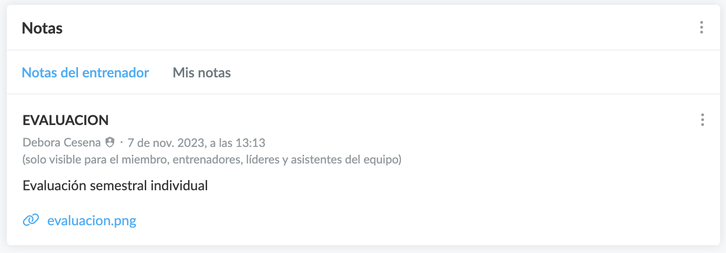 Además del titulo y la nota en sí misma, también puedes adjuntar un archivo en la nota. Quedará el registro con la fecha y hora en que fue creada, y el nombre del entrenador que la creó.