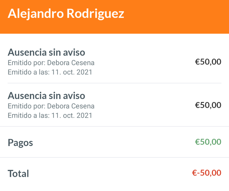 Ejemplo: Alejandro ha pagado solo 1 de las 2 sanciones que tenia de Є 50, por lo que una de las sanciones sigue pendiente (texto en rojo). El texto verde es el importe pagado (Є50).