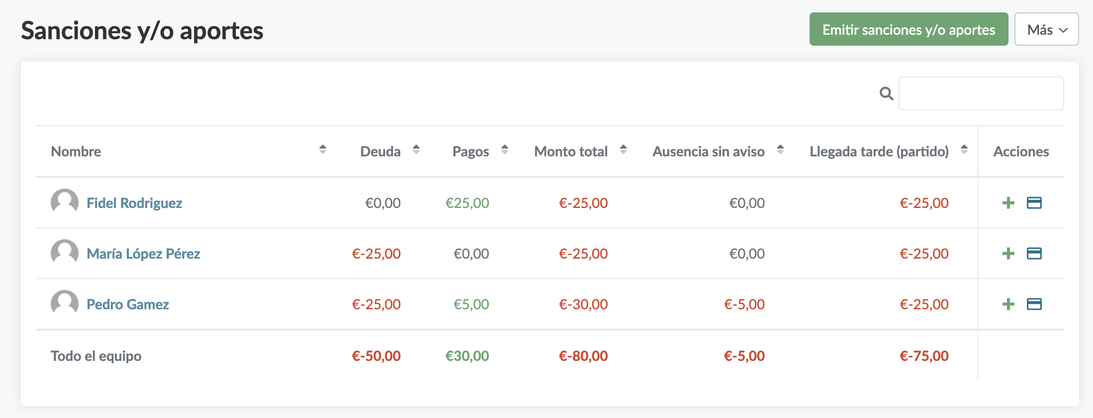 Bajo El equipo podrás consultar el balance total con el resumen de sanciones creadas y aportes recibidos por los deportistas del equipo.