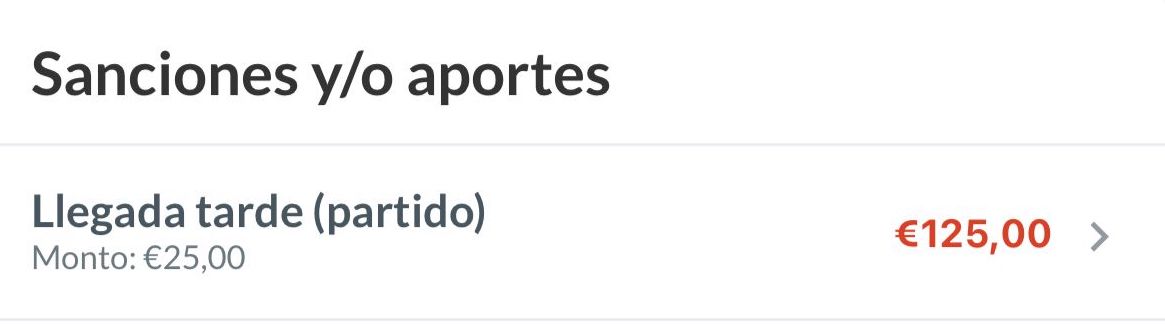 Ejemplo: en este equipo la llegada tarde a un partido conlleva una sanción de € 25. Hasta el momento, se han impuesto sanciones por un total de € 125.