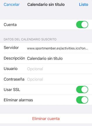 Simplemente presiona en "Eliminar cuenta", y el calendario de SportMember sincronizado se habrá eliminado de tu calendario personal.
