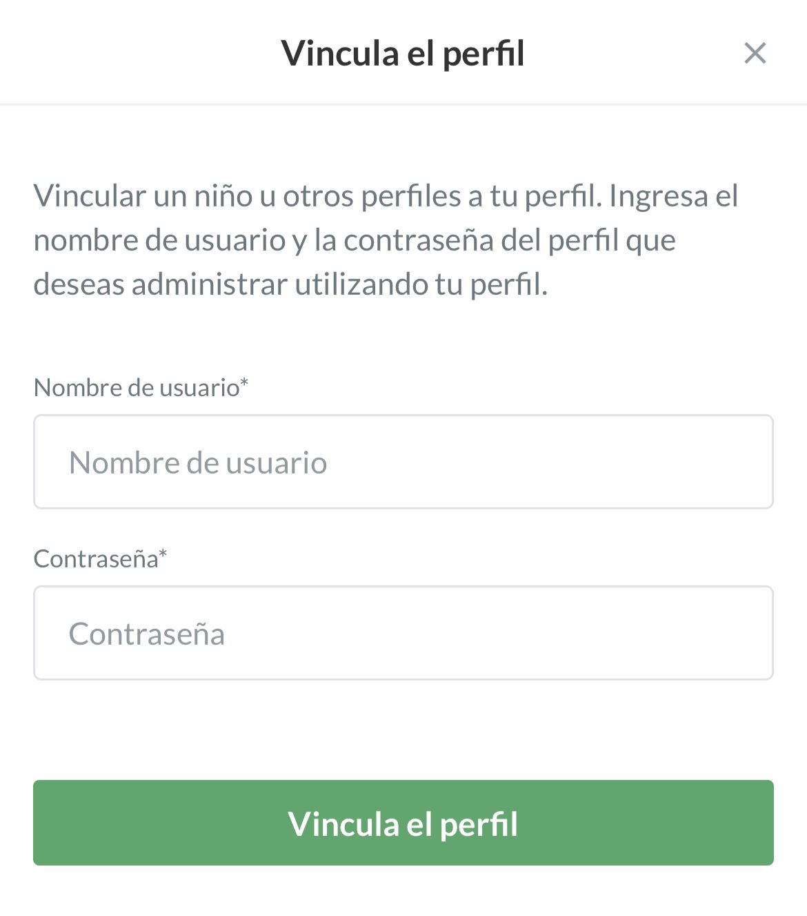 Ingresa el nombre de usuario y la contraseña del perfil ya creado de tu hijo/a.