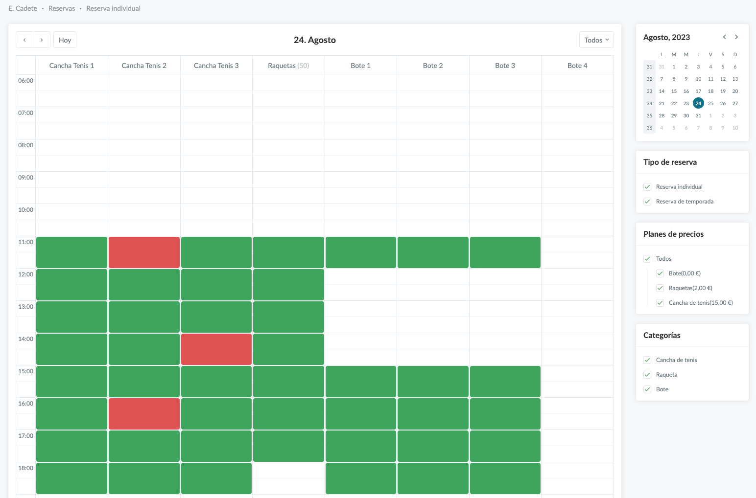 NOTA: es posible filtrar por el Tipo de reserva (reserva individual o de temporada), el Plan de precios y las Categorías en el margen derecho.